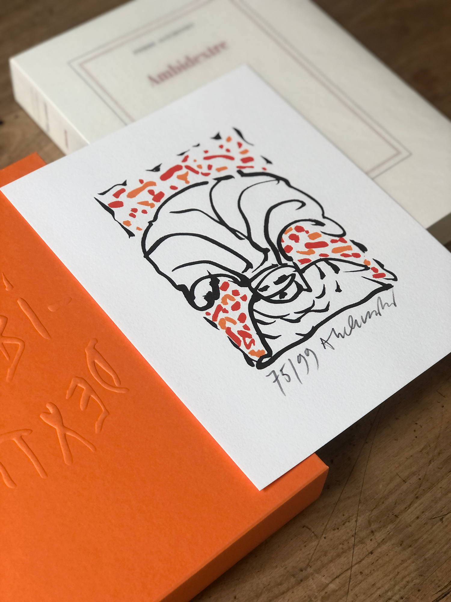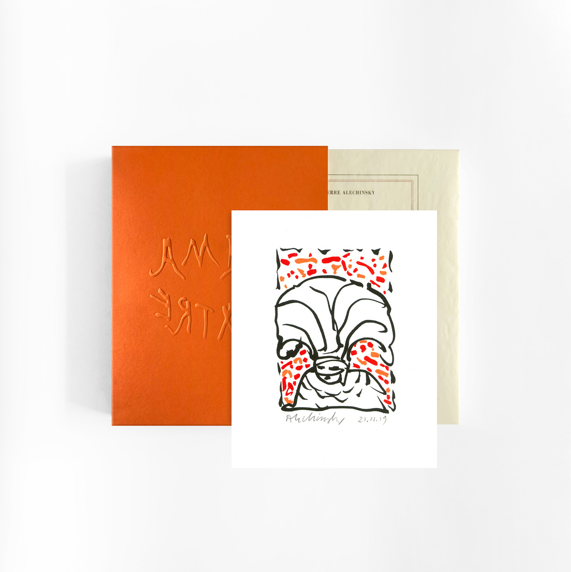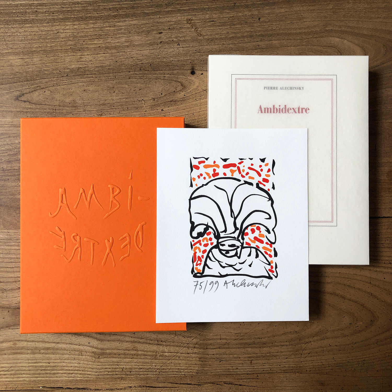 Exemplaire de tête d’Ambidextre de Pierre Alechinsky, sous emboîtage, comportant une gravure imprimée sur papier vergé du XVIIIe siècle par RLD, Paris. Toutes les épreuves sont signées et numérotées.