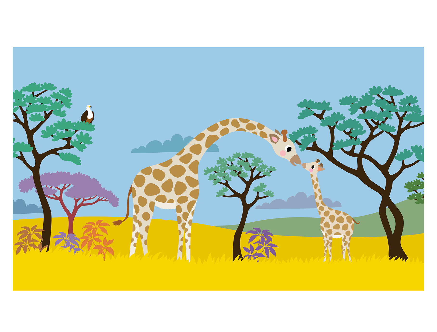 Les câlins des animaux de la savane : la girafe, l'éléphant, le singe, le lion, l'hippopotame. « Moi, j'aime les câlins tout doux, tout chauds, qui font fermer les yeux et dormir aussitôt. Regarde, je me blottis, je ronronne... et fais dodo ! »