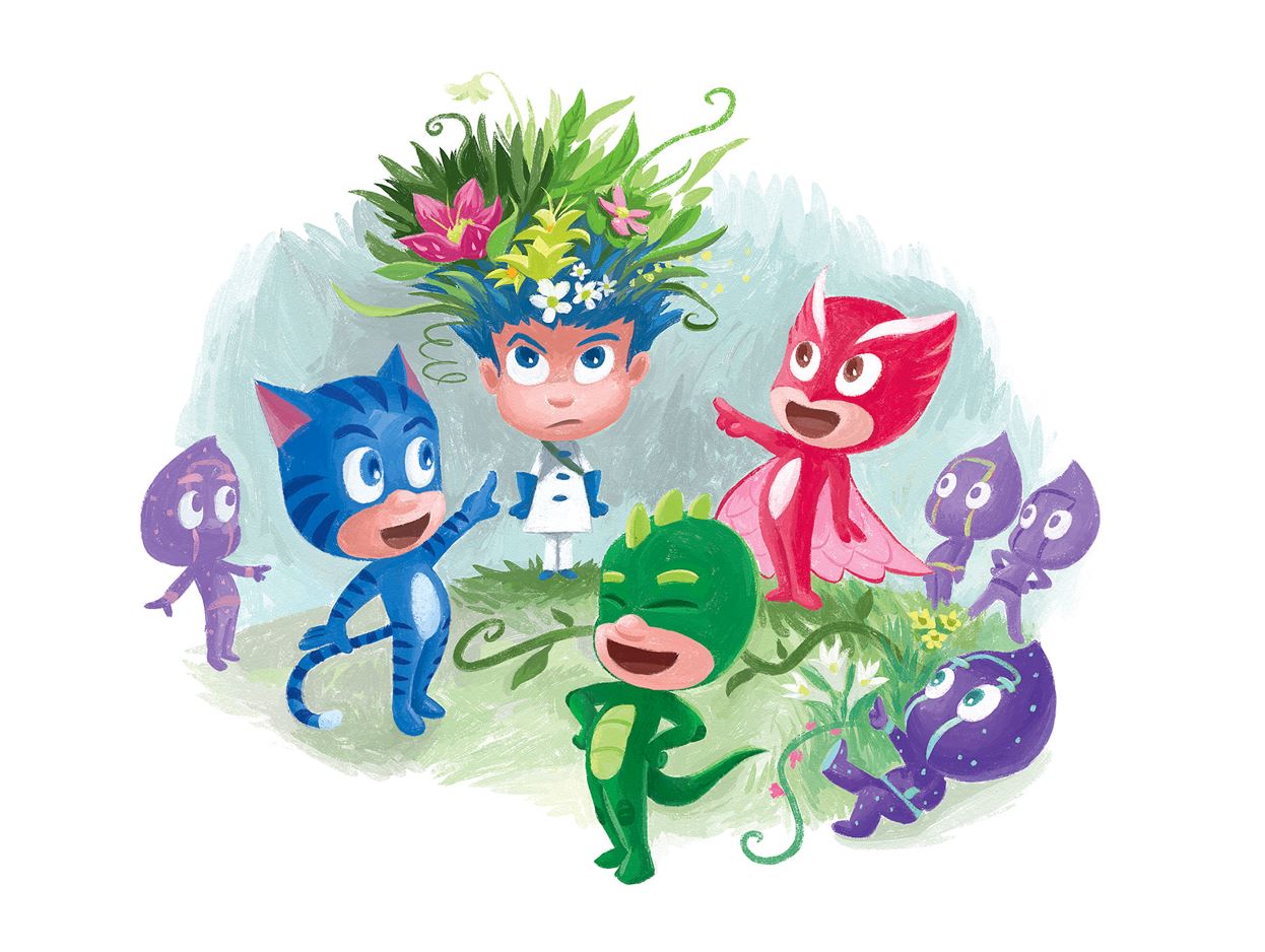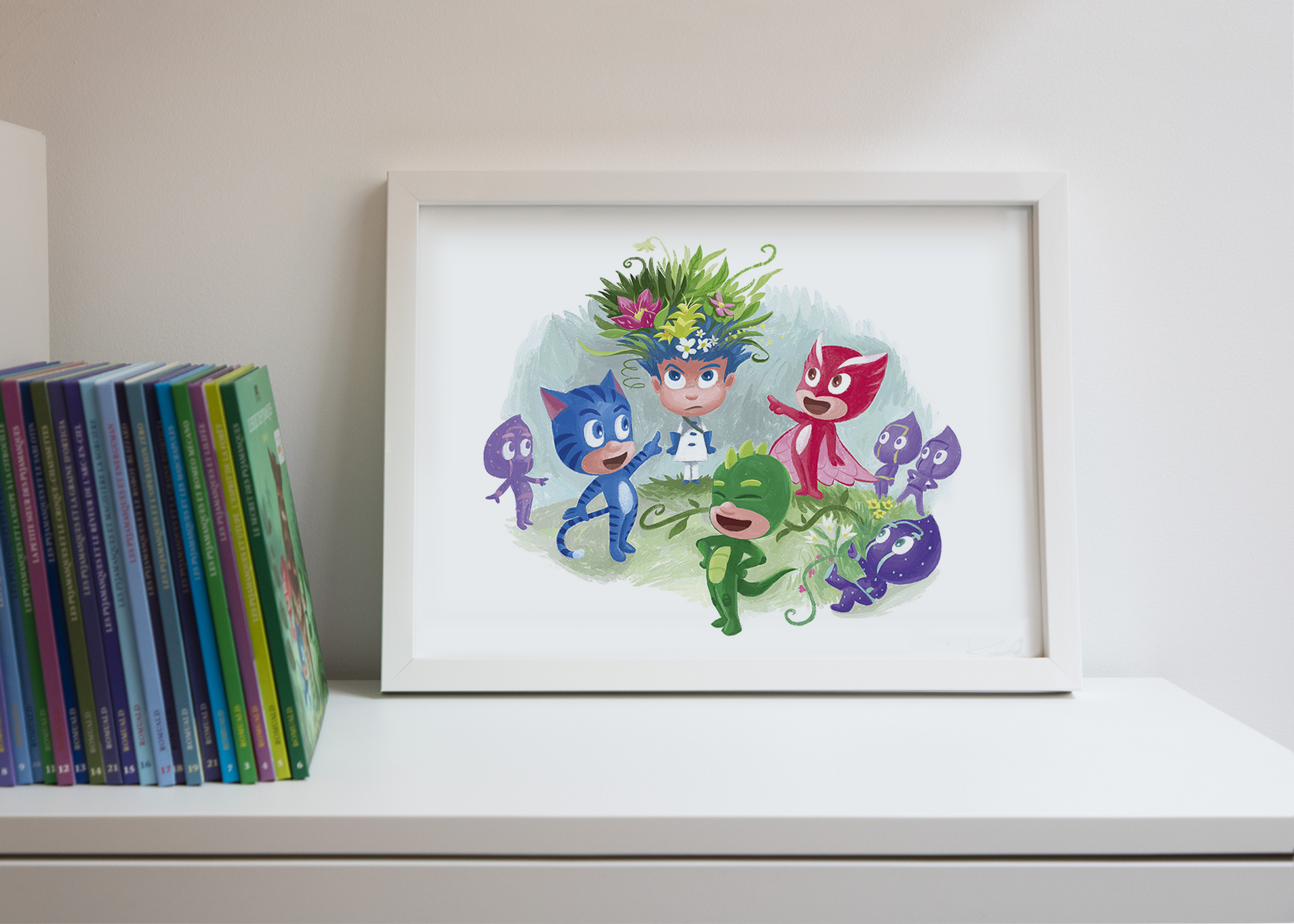 Illustration tirée du l'ouvrage Les Pyjamasques et la graine d’Orticia : série unique limitée à 30 exemplaires numérotés et signés à la main par l’artiste, accompagnée de son certificat d’authenticité.